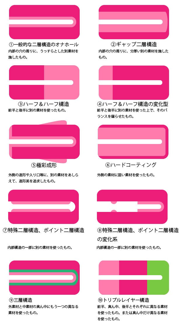 각각의 특징이나 대표적인 오나홀 등까지 기재하자면 너무나 막대한 정보량이 되어버릴 것 같으므로,