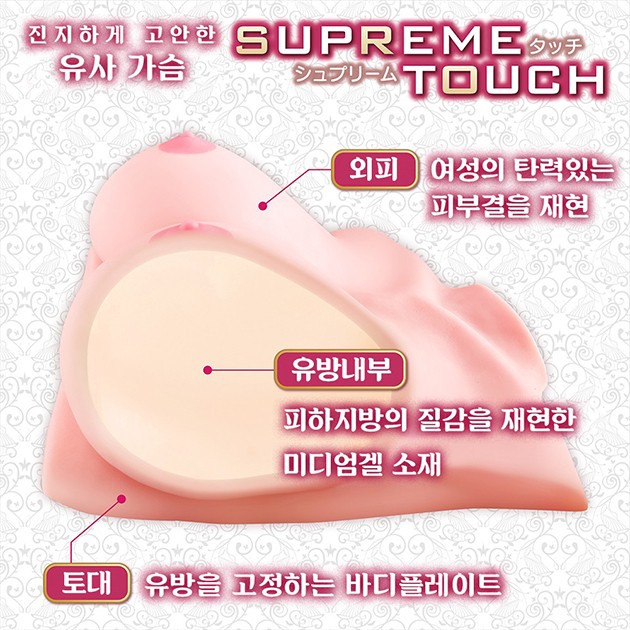 Supreme Touch는 가슴을 진지하게 생각하여 만들어낸 페이크 버스트입니다. 우선은 ‘품질’부터. 안심하고 접할 수 있도록 ‘국내소재로 국내제조’ 했습니다. 원재료에 들어가는 기름은 ‘식품 등급’만을 사용하여, ‘공업 등급’은 일절 사용하지 않았습니다. 그리고 물론 ‘성능’도 진지하게. 쥐고, 끼우고, 꼬집는 등 ‘마음껏 가슴을 만끽’ 할 수 있도록 설계했습니다. ・외피 : 여성의 탄력 있는 피부결을 재현. ・내부 : 피하지방의 부드러운 질감을 재현한 미디엄 겔 소재를 내포. ・토대 : 바디 플레이트로 뚜렷하게 유방을 고정하여 편리성까지. Supreme Touch를 올려서 즐길 수 있는 2.5차원 포스터와 편리한 전용 블리스터 케이스가 동봉되어 있습니다 어른이기 때문에야말로, 가슴이 필요하다. |