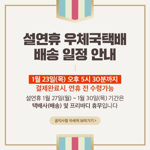 명절 전후 1/23(목)~1/31(금) 기간은 택배 물량 증가로 인해 익일 수령이 어려울 수 있사오니